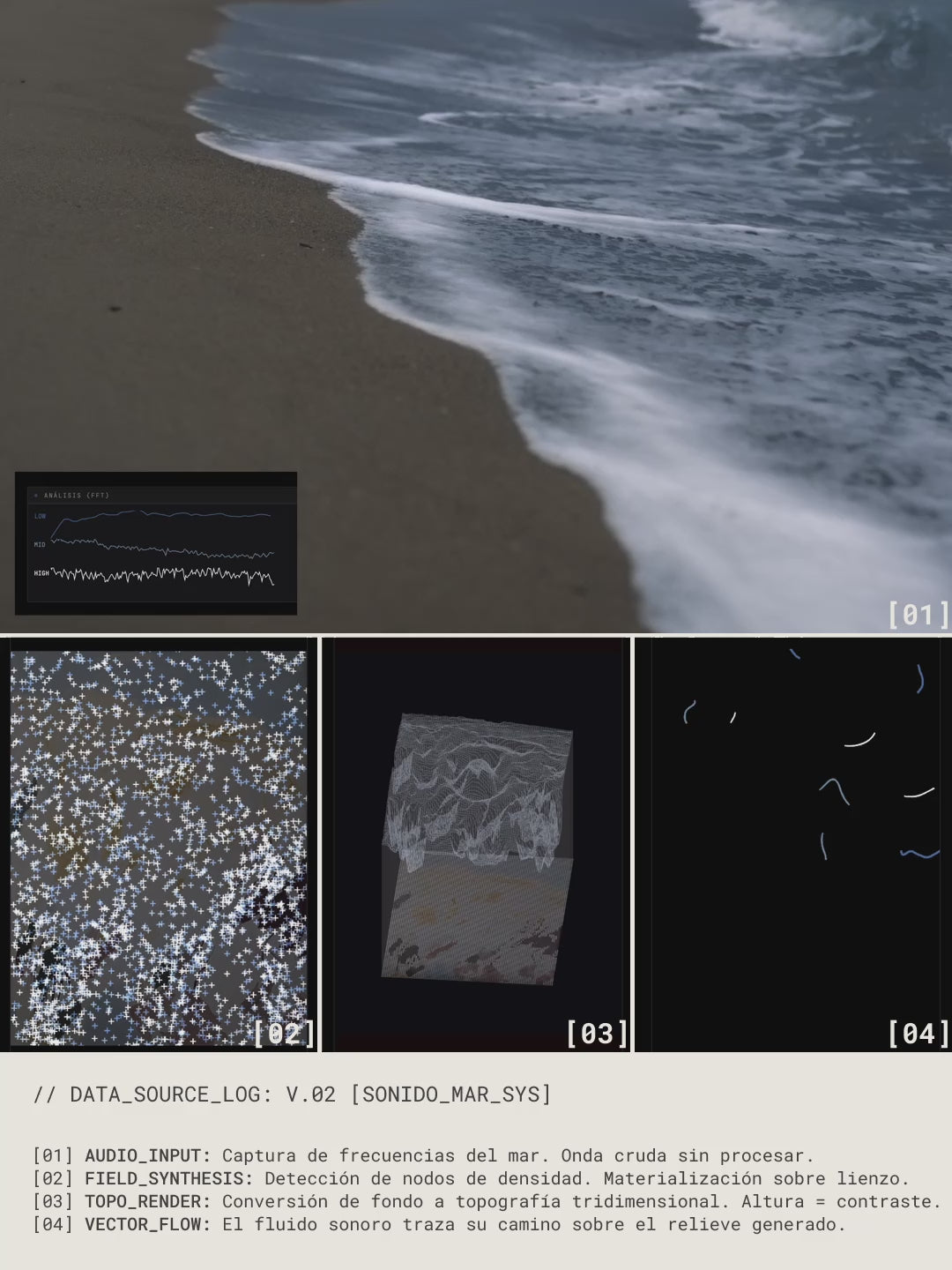 > El audio de origen, así como todo el proceso algorítmico lo encuentras en el chip NFC que incluye tu obra. Tú y quien visite tu espacio pueden acercar su celular a la obra y ver el origen exacto de esta pieza. Es parte de la experiencia.